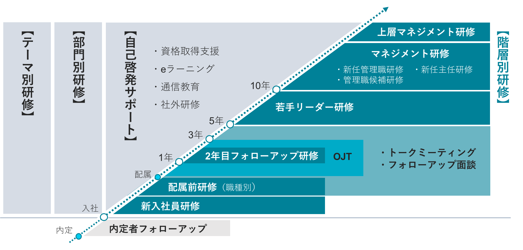 階層別研修や部門別研修などの幅広い学びの選択肢を用意しています。